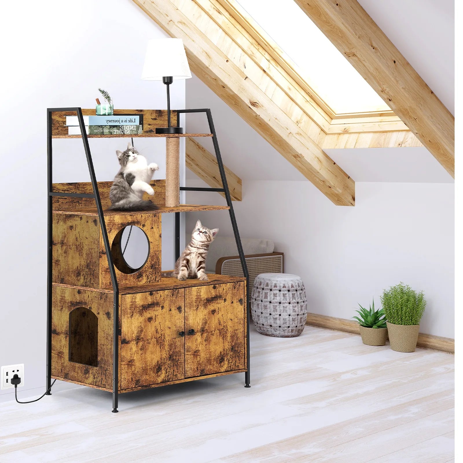 - You’ll enjoy an integrated charging station that powers devices while your cat uses a dedicated washroom with a cat tree tower nearby.